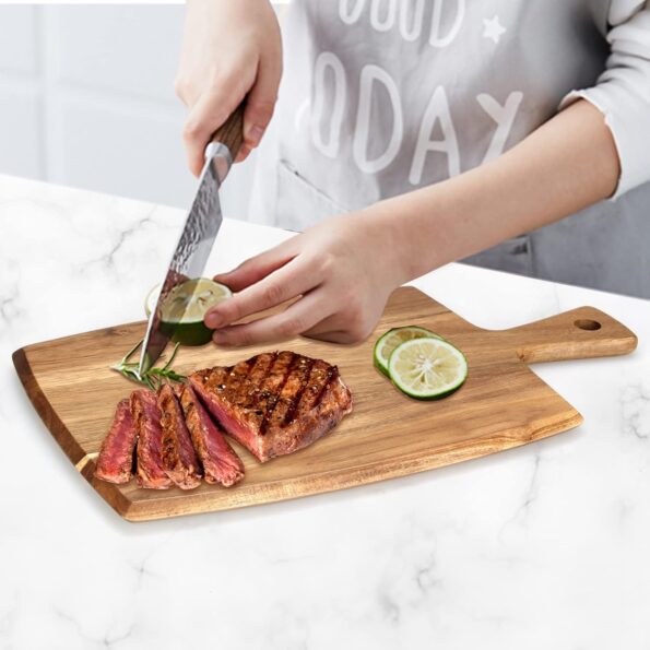- 100% Acacia Wood: This acacia cutting board is made of food-grade acacia wood which is a sustainable material that doesn’t harm our environment. Acacia is famous for being virtually indestructible, the wood has a beautiful natural polish and a sweet smell. No BPA, PVC or toxic finishes.