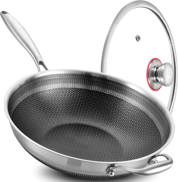 - New Hybrid Ceramic Coating:The 13 inch stainless steel wok pan with lid using 3 layers of ceramic paint spray and scratch-resistant etching process, is safe and non-toxic, ensures the non-stick performance and durability of maximum extent