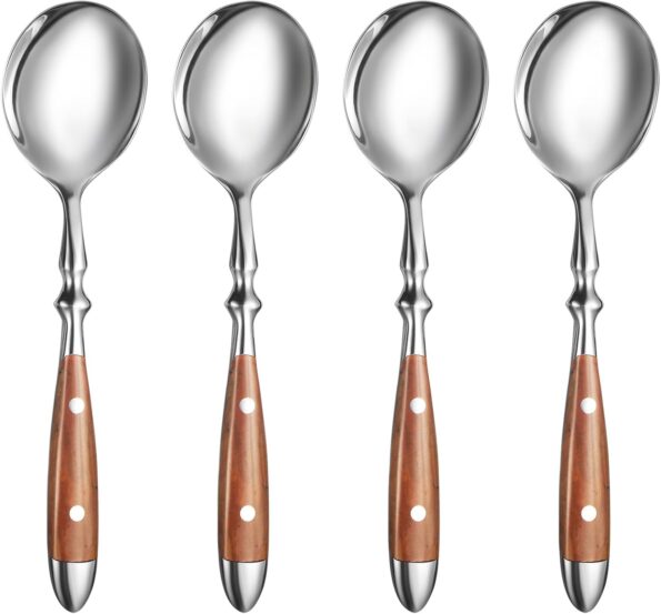 Soup Spoons,4Pcs Soup Spoons Set,Stainless Steel 18/8 Spoons with Comfortable Bakelite Handle,Heavy-Weight Metal Round Spoons,Wood Grain Handle
